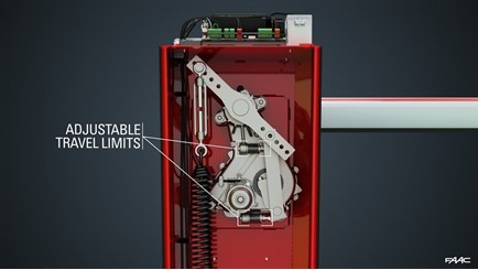 The barrier uses a 24 V DC motor with integrated encoder, providing precise motion control and built-in anti-crush safety. The dual-spring counterbalance system ensures smooth opening and closing of the longer 5 m beam, maintaining consistent performance and reduced motor strain.
